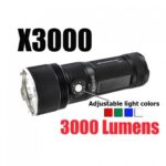 The PowerTac X3000 is a unique high intensity and high quality white light with color LED Flashlight, it has individual Red, green, royal blue LEDs and 3 CREE XM-L2 LEDs driven to its maximum. It is packed with many functions and color options coupled with different levels of brightness and strobe modes. It will save the moment whether you need a bright light for signaling or charging your smart phone. It can be charged by the included AC charger.
